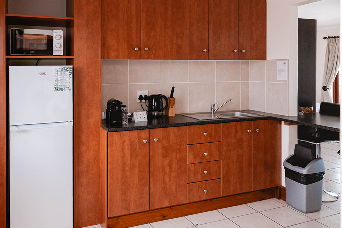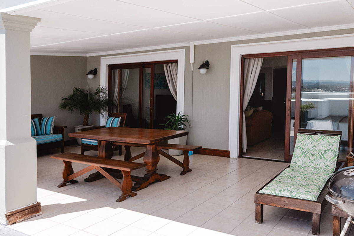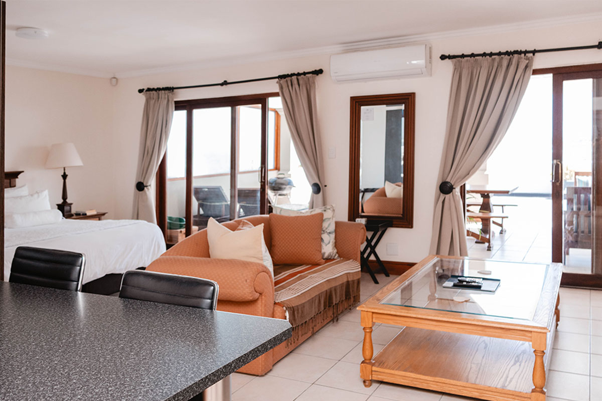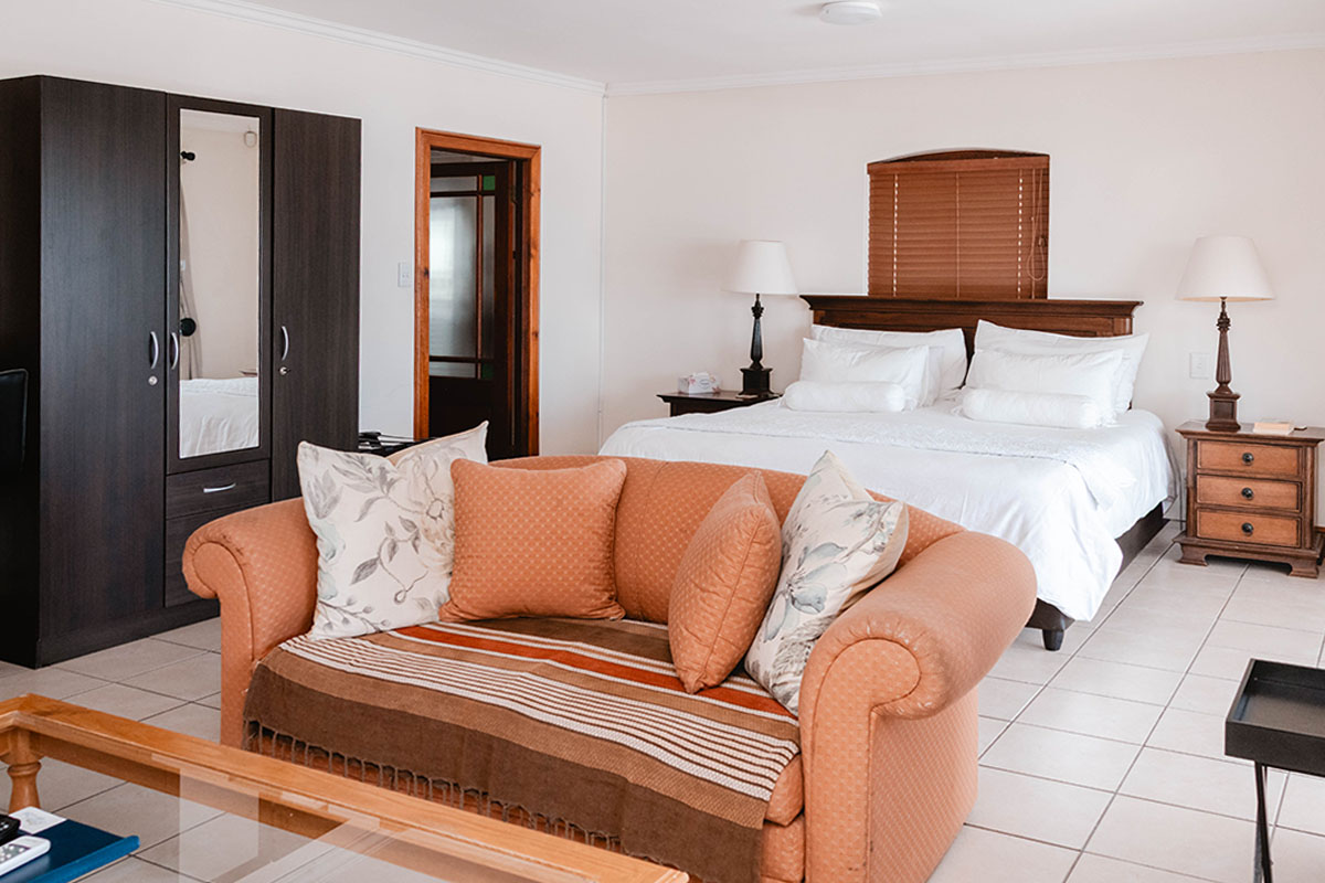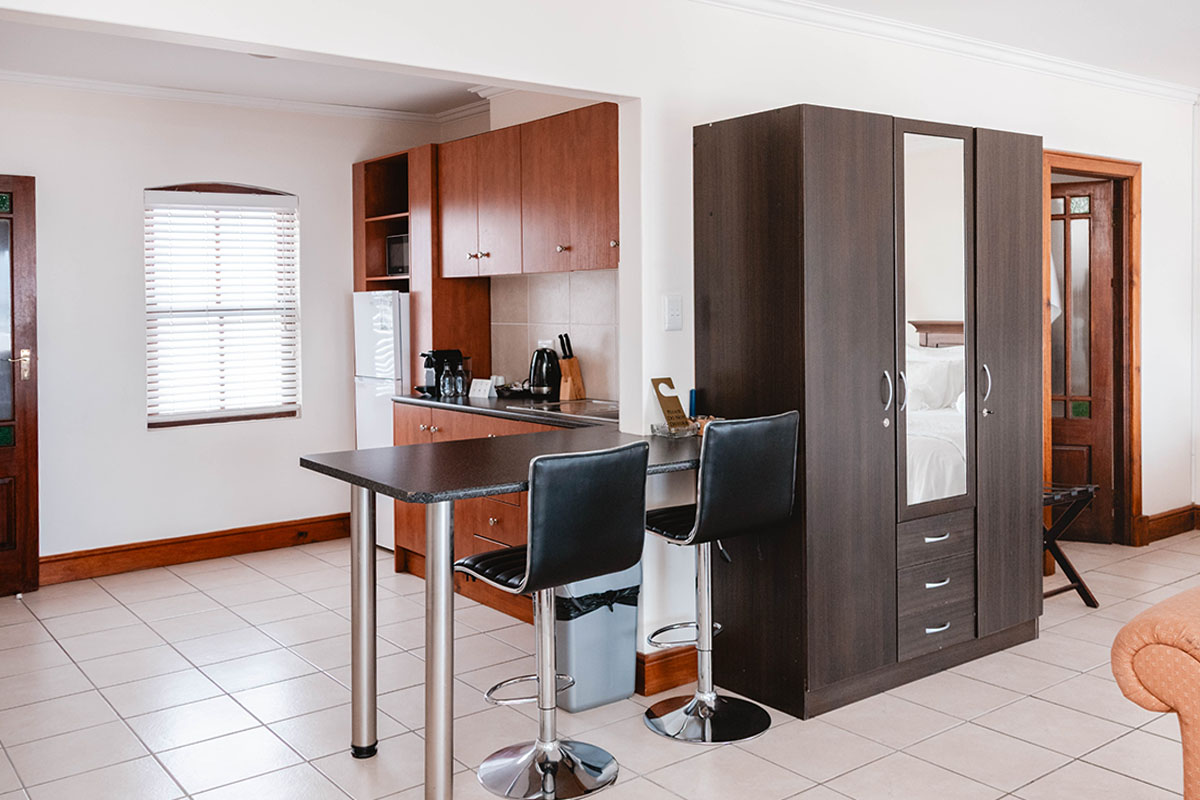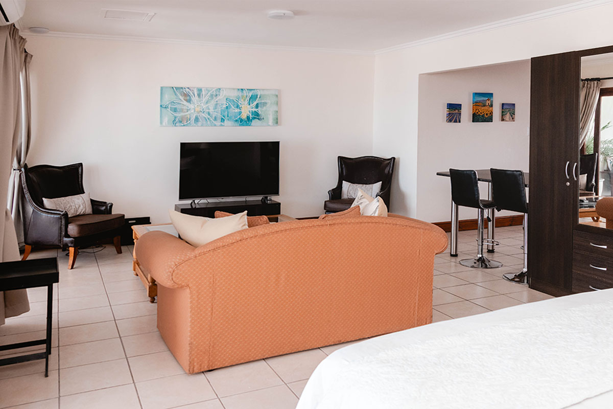 This Penthouse on the top floor of the guesthouse has a 360-degree view from the large patio, a king bed, a full en-suite bathroom, a smart TV with selected DStv channels, air conditioning, a kitchenette with a Nespresso machine and a private braai.